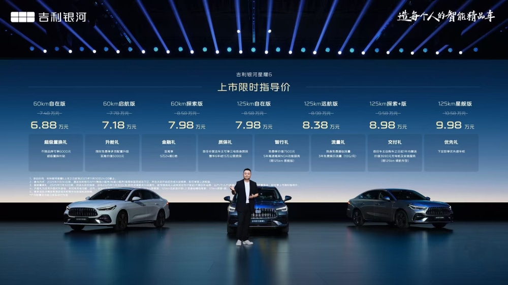 10月30日,新一代国民电混家轿吉利银河星耀6全球上市。新车共推出60km自在版、60km启航版、60km探索版、125km自在版、125km远航版、125km探索+版、125km星舰版7个版型,上市限时指导价为6.88万元-9.98万元。凡在11月30号前下订吉利银河星耀6并锁单的用户,即可享受6000元超级置换金。此外,用户还可尊享包括升舱礼、金融礼、质保礼、智行礼、流量礼、交付礼、优先礼在内的多重购车权益。
