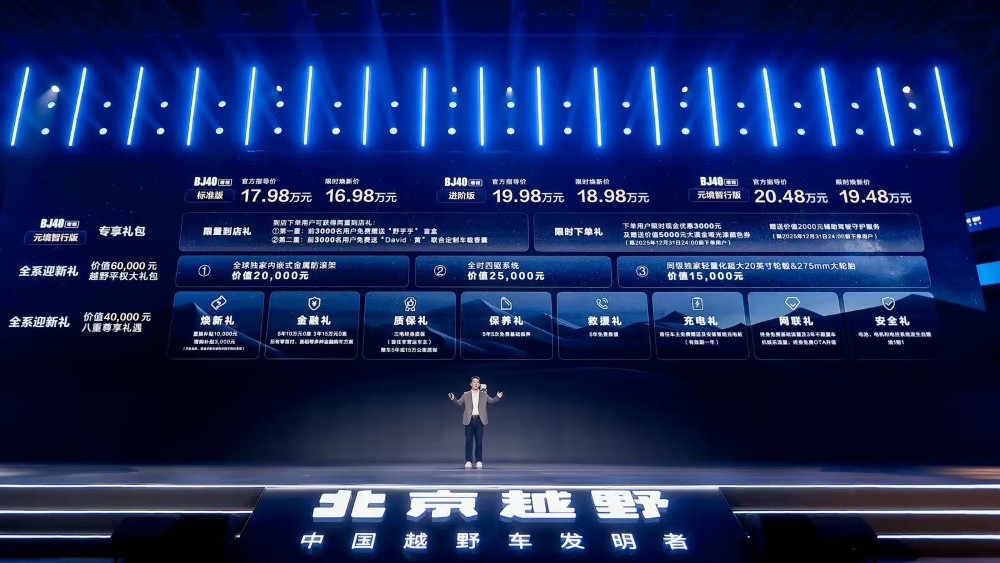 第二大全系迎新礼为价值四万元的八重尊享礼遇,其中特别值得一提的是“安全礼”,北京越野在硬派SUV行业内率先推出“烧一赔一”政策与承诺:BJ40增程如因增程动力系统质量原因导致车辆热失控,北京越野将赔付同等或高于原车配置的全新车辆一台,并支付购置税、车船税、交强险、上牌费,最大程度保障用户权益。