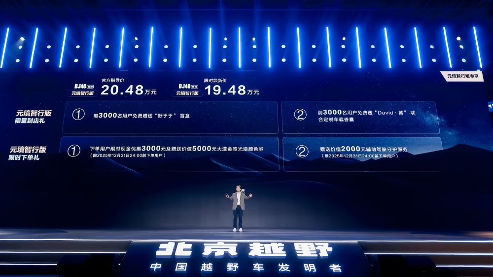 此外,北京越野还带来了元境智行版专享礼包:限量到店礼和限时下单礼。两项限量到店礼:前3000名用户,免费送“野乎乎”盲盒和北京越野与国际知名调香师David·黄联合定制的车载香囊。两项限时下单礼:第一项:从即刻起到年底下订用户,限时享现金优惠3000元,以及价值5000元的大漠金哑光漆颜色券;第二项:从即刻起到年底下定用户,限时赠送价值2000元的辅助驾驶守护服务。