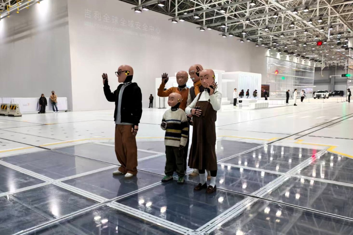 门口还站着几个“假人”,有爷爷、奶奶、爸爸、妈妈和儿子,他们动作自然,互动亲切,我和另外几位媒体老师站在他们面前端详了许久,并一直在讨论他们究竟是吉利最新研发的人形机器人,还是由真人扮演的假人。直到看见那个小男孩整理他的头套,我们才恍然:哦,敢情今天这场不是AI技术发布会,是安全发布会,他们确实是由真人扮演的假人,目的是为了替那些不能言语,不知伤痛,却在一次次默默承受撞击的过程中,用数据守护了真实的家庭成员乘车安全的假人们,表达一些东西。