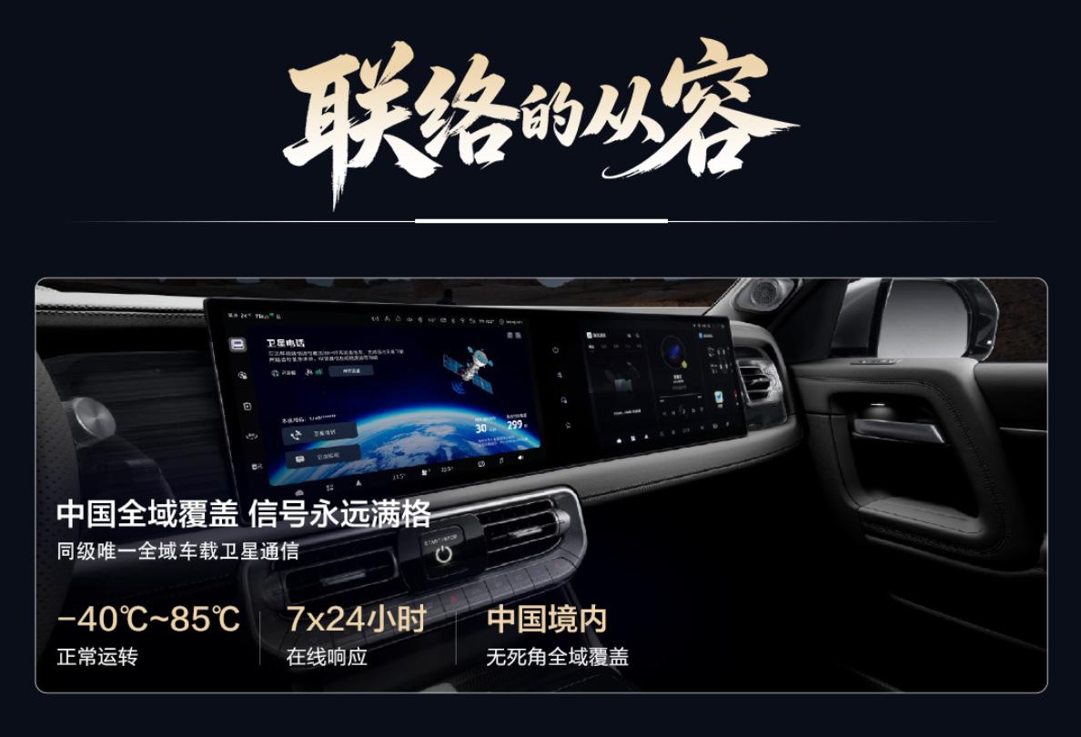BJ60增程行政版搭载原厂全域车载卫星通信,是同级唯一全域车载卫星通信。基于天通卫星专网,BJ60增程行政版实现中国境内无死角通信覆盖,可以在零下40℃至零上85℃范围内正常运转,7X24小时在线响应,确保用户在无人区等极端环境下永不断联。