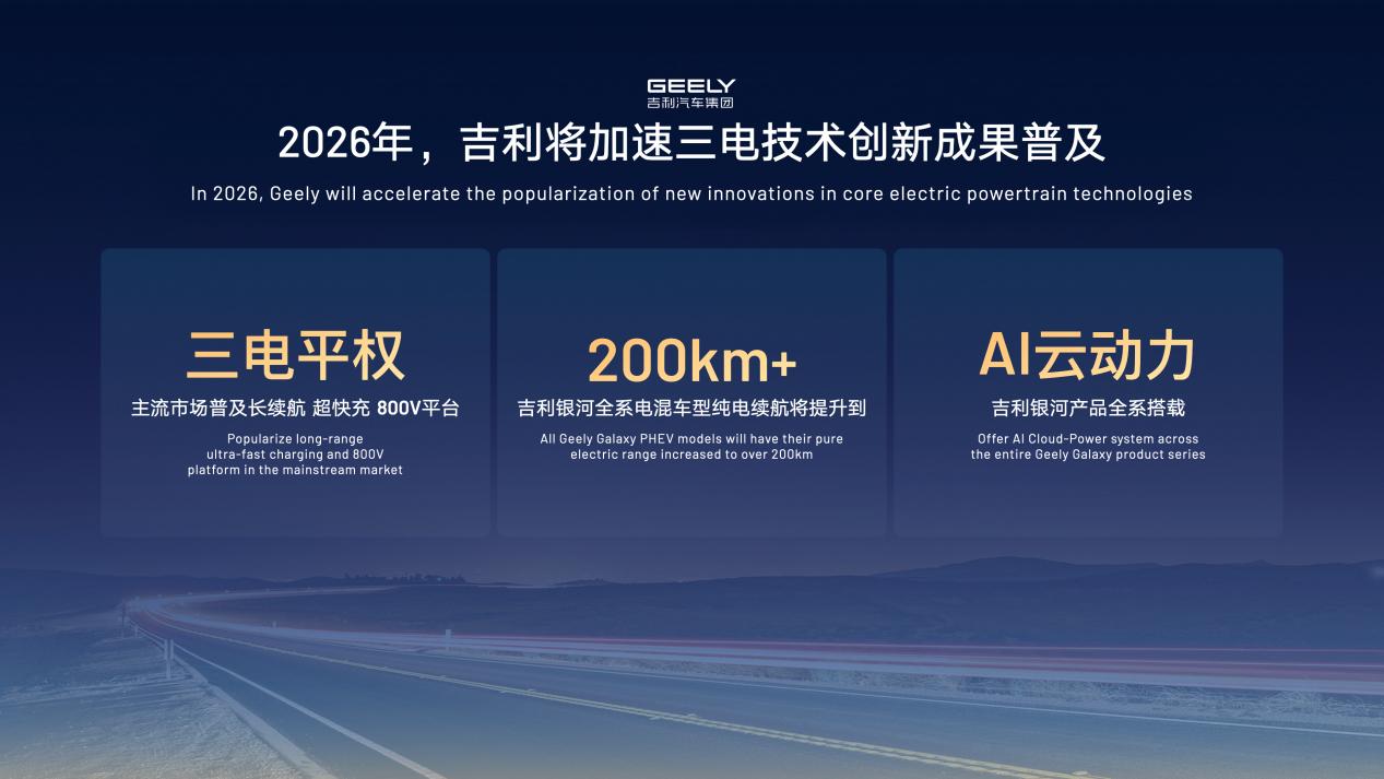 在HEV混动领域,吉利将在2026年上半年推出全球新一代油电混动技术——i-HEV智能双擎。作为全球首个应用“AI云动力”的油电混动系统,i-HEV可将HEV百公里油耗降至3L,整车功率较主流HEV提升至少20%,让燃油车同样拥有出色电感体验。今年,吉利汽车将陆续推出4到5款全新混动车型。
