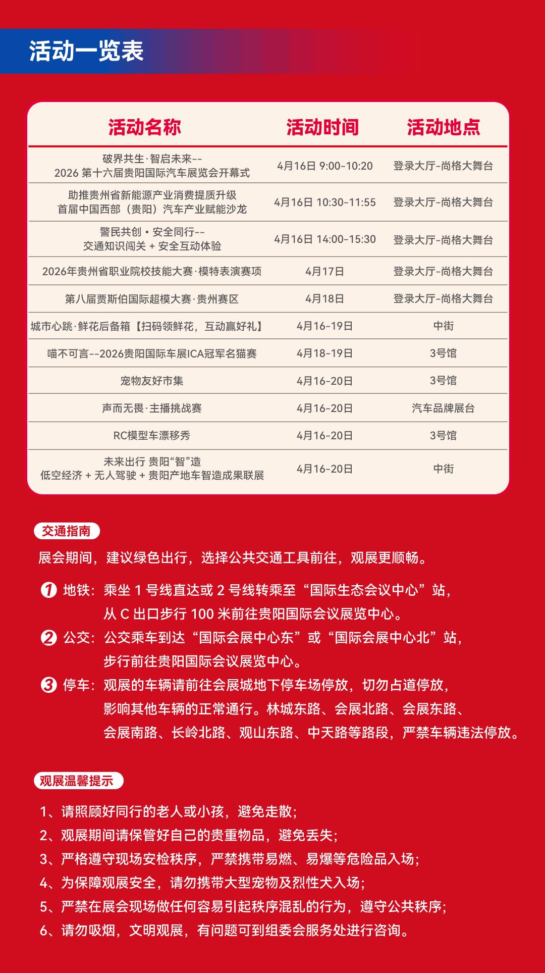 贵阳市交管局交安宣传进车展、贵州省职业院校技能模特大赛、第八届贾斯伯国际超模大赛贵州赛区、鲜花后备箱集市、贵阳国际车展ICA冠军名猫赛、RC模型车漂移秀、宠物友好市集、“声而无畏”汽车主播挑战赛等精彩活动将轮番上演,让车展不仅是科技与消费的盛宴,更是一场全民乐享的城市嘉年华。