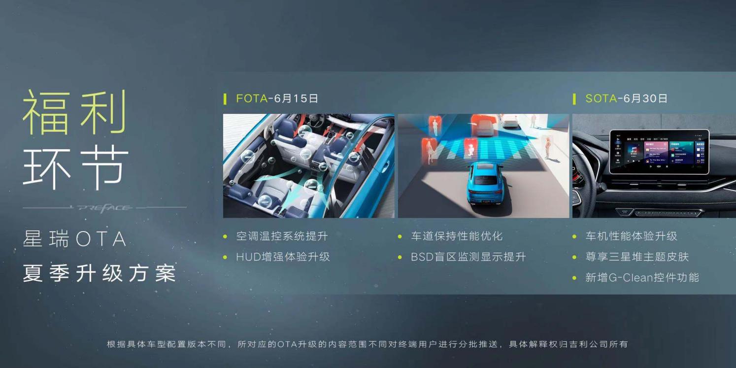 另据悉,除了加推“时空版”新车型,根据前期用户的反馈需求,本次吉利星瑞还带来了OTA夏季升级福利,公布将于6月15日对FOTA进行升级,其升级内容为车道保持性能优化、HUD增强体验升级、空调温控系统提升、BSD盲区监测显示提升等;同时还将于6月30日对SOTA进行升级,主要升级在车机性能体验升级,新增尊享三星堆主题皮肤和G-Clean控件功能,进一步提升用户的驾乘体验,常用常新。