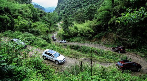 在媒体老师的一致坚持下,工作人员找来了猴子沟里的护林人,现场进行紧急磋商,最终还是基于对车辆性能的信心,作出了继续往前的决定。而车队中的两台竞品车——以空间见长的大众途观L,和凸显商务气质的别克昂科威,由于在之前的复杂路况试驾环节中已经遇到过一些麻烦,因此大家一致决定把这两台车留在山道入口处,车上人员全部换乘Jeep的专业SUV继续向山中进发。