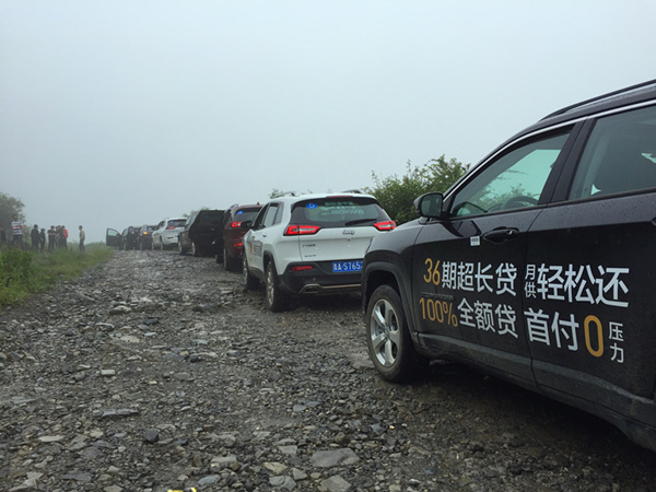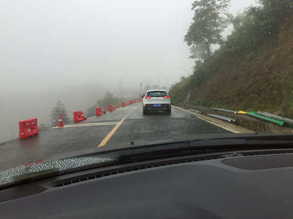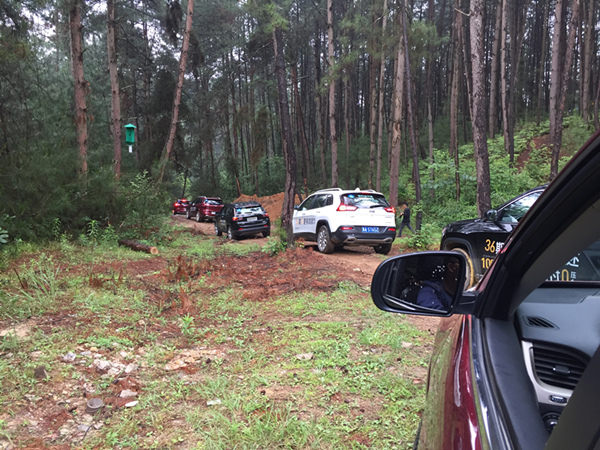 然而,活动当天一早,天空就开始下雨,时断时续。到上午9点试驾车队从孟关金中豪Jeep 4S店出发时,雨势虽然暂时收止,但天空中仍然笼罩着厚厚的云层。这样的天气,无疑给活动组织者带来了不小的困扰,因为湿滑的路面,和能见度下降的盘山公路,让车队在行进过程中的不确定因素增加,安全系数降低。