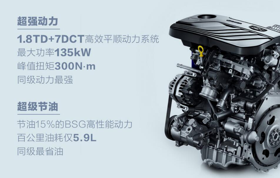 其中,1.8TD“中国心”十佳发动机最大功率135kW,峰值扭矩300N·m。7DCT高效湿式双离合变速箱传动效率高达97%,拥有0.2s极速换挡体验。